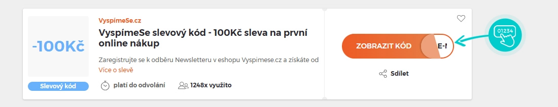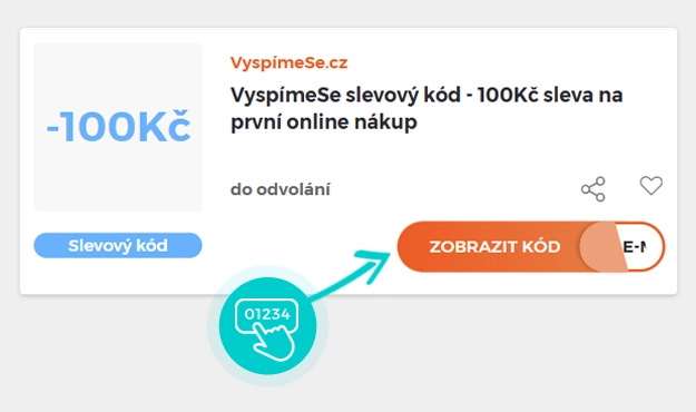 Vyberte si konkrétní slevový kód na naší stránce, který si chcete uplatnit v eshopu Vyspimese.cz. Klikněte na oranžové tlačítko "Zobrazit kód".