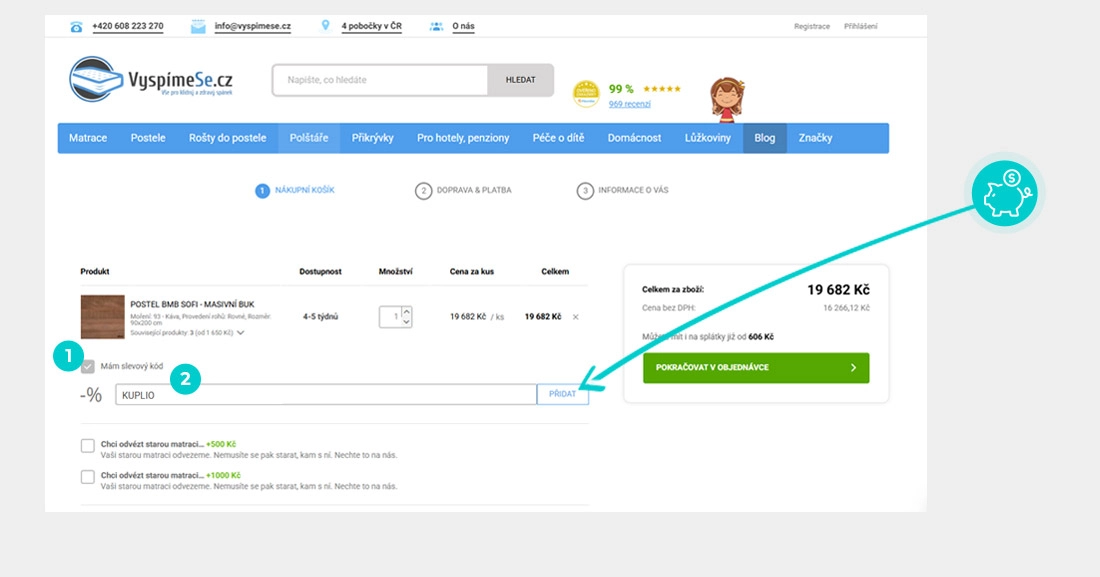 Vyberte si produkt v eshopu Vyspimese.cz, o který máte zájem, stiskněte tlačítko "Vložit do košíku" a produkt se automaticky vloží do nákupního košíku. Přímo v nákupním košíku pod vybranými produkty klikněte na políčko "Vložit slevový kupón". Zde vložte zkopírovaný slevový kód nebo jej ručně vepište a potvrďte tlačítkem "Přidat".