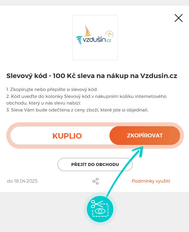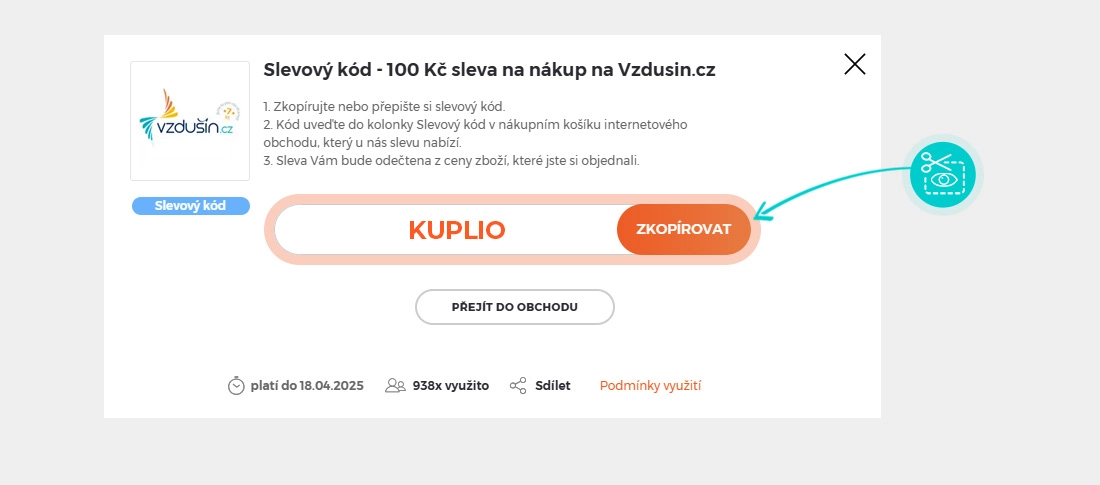 Zkopírujte nebo si opište slevový kód a klikněte na tlačítko "Přejít do obchodu". Následně budete přesměrováni přímo do e-shopu Vzdusin.cz.