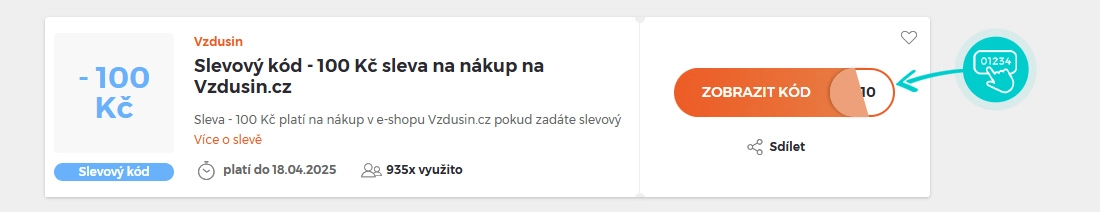 Vyberte si konkrétní slevový kód na naší stránce, který si chcete uplatnit v e-shopu Vzdusin.cz. Klikněte na oranžové tlačítko "Zobrazit kód".