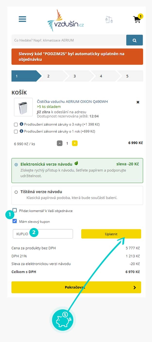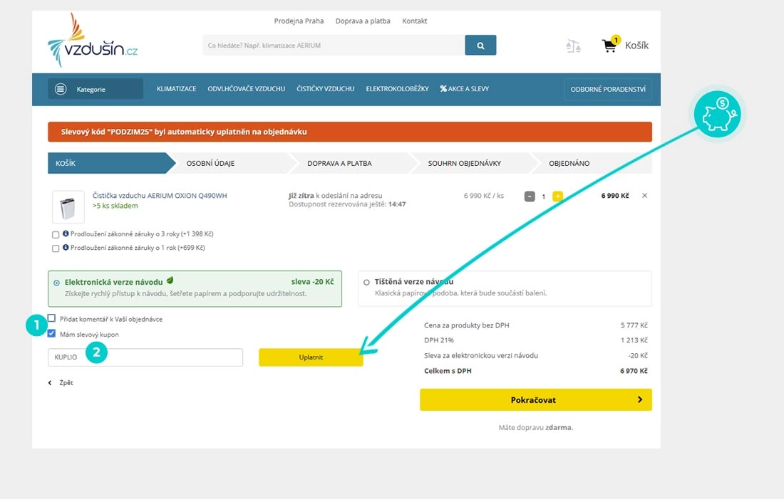 Vyberte si produkt v e-shopu Vzdusin.cz, o který máte zájem, stiskněte tlačítko "Přidat do košíku" a produkt se automaticky vloží do nákupního košíku. Přímo v nákupním košíku najdete pod vámi vybraným produktem zaškrněte políčko "Mám slevový kupon". Otevře se vám políčko, kde vložte zkopírovaný slevový kód nebo jej ručně vepište a potvrďte tlačítkem "Uplatnit".