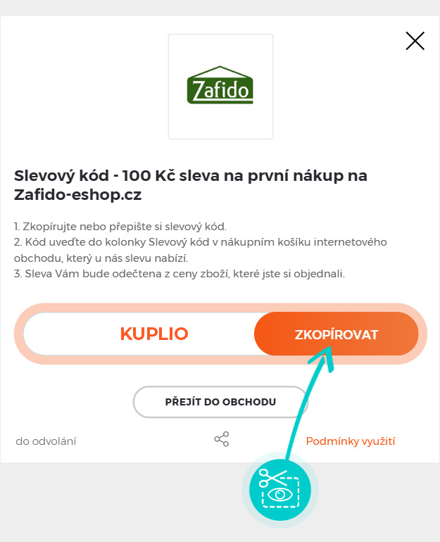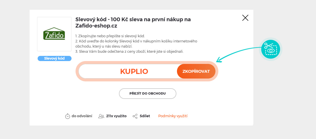 Zkopírujte nebo si opište slevový kód a klikněte na tlačítko "Přejít do obchodu". Následně budete přesměrováni přímo do eshopu zafido-eshop.cz.