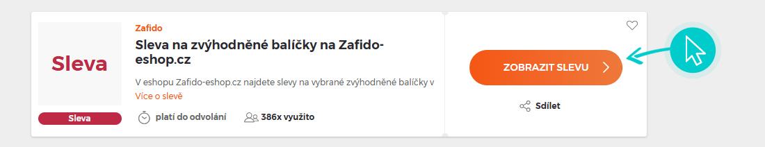 Vyberte si na naší stránce konkrétní Zafido slevu a klikněte na tlačítko "Zobrazit slevu". Automaticky budete přesměrováni přímo na akční nabídku v internetovém obchodě zafido-eshop.cz, kde můžete produkt nakoupit se slevou.