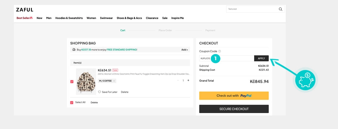 Vyberte si produkt v e-shopu Zaful.com, o který máte zájem, stiskněte tlačítko "Vložit do košíku" a produkt se automaticky vloží do nákupního košíku. Přímo v nákupním košíku pod vybranými produkty v sekci Dokončit objednávku klikněte na políčko "Coupon Code“. Zde vložte zkopírovaný slevový kód nebo jej ručně vepište a potvrďte tlačítkem "Apply“.