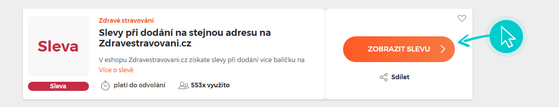 Vyberte si na naší stránce konkrétní Zdravé stravování slevu a klikněte na tlačítko "Zobrazit slevu". Automaticky budete přesměrováni přímo na akční nabídku v internetovém obchodě zdravestravovani.cz, kde můžete produkt nakoupit se slevou.