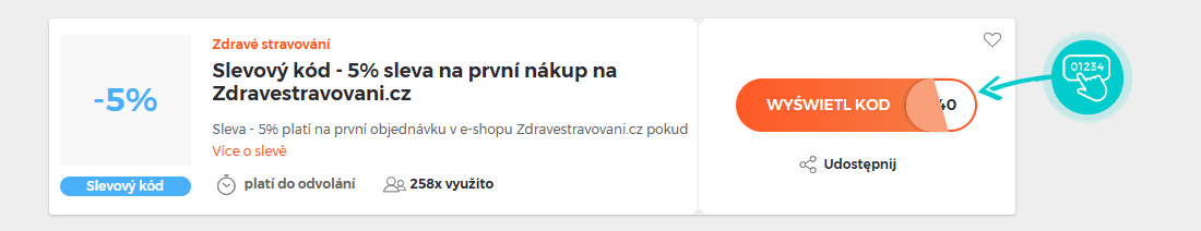 Vyberte si konkrétní slevový kód na naší stránce, který si chcete uplatnit v eshopu zdravestravovani.cz. Klikněte na oranžové tlačítko "Zobrazit kód".
