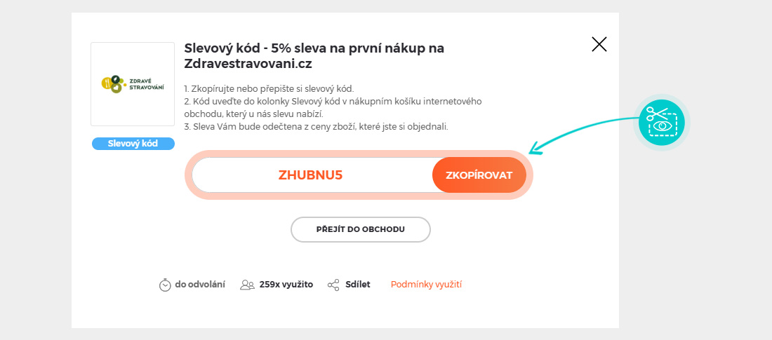 Zkopírujte nebo si opište slevový kód a klikněte na tlačítko "Přejít do obchodu". Následně budete přesměrováni přímo do eshopu zdravestravovani.cz.