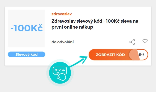 Vyberte si konkrétní slevový kód na naší stránce, který si chcete uplatnit v eshopu zdravoslav.cz. Klikněte na oranžové tlačítko "Zobrazit kód".
