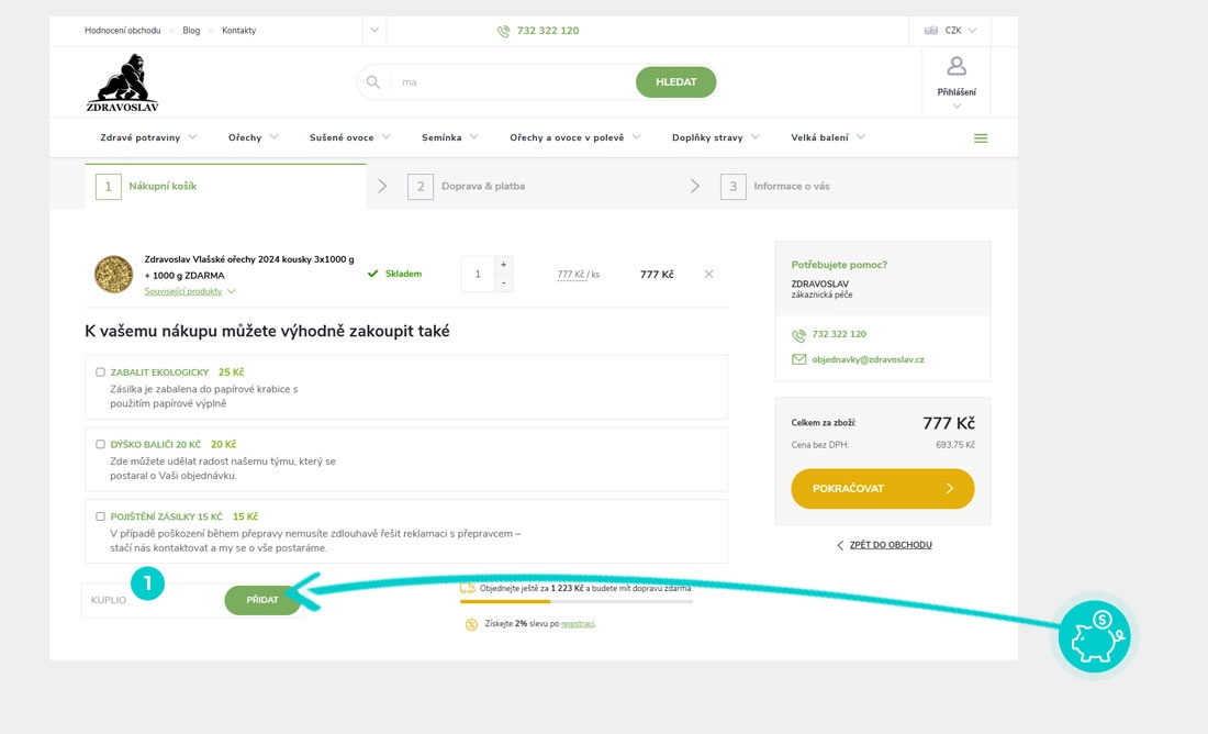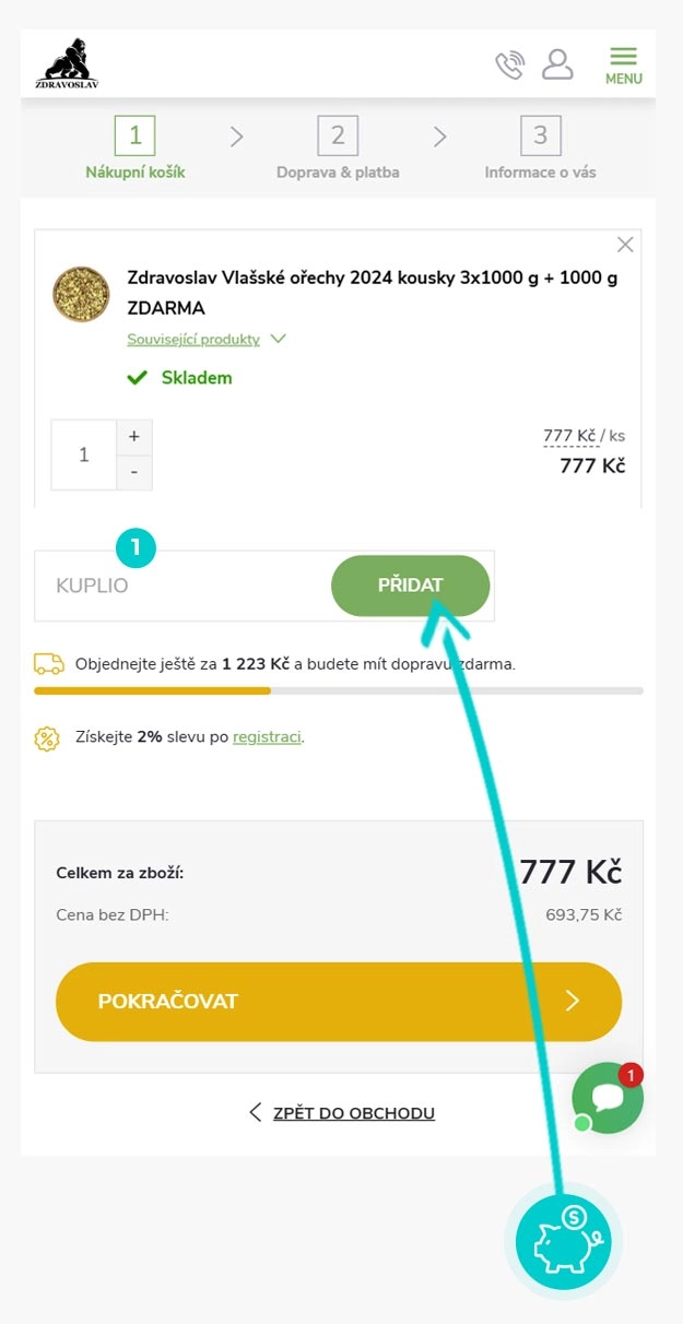 Vyberte si produkt v eshopu zdravoslav.cz, o který máte zájem, stiskněte tlačítko "Do košíku" a produkt se automaticky vloží do nákupního košíku. Přímo v nákupním košíku pod vybranými produkty klikněte na políčko "Vložit slevový kupón". Zde vložte zkopírovaný slevový kód nebo jej ručně vepište a potvrďte tlačítkem "Přidat".