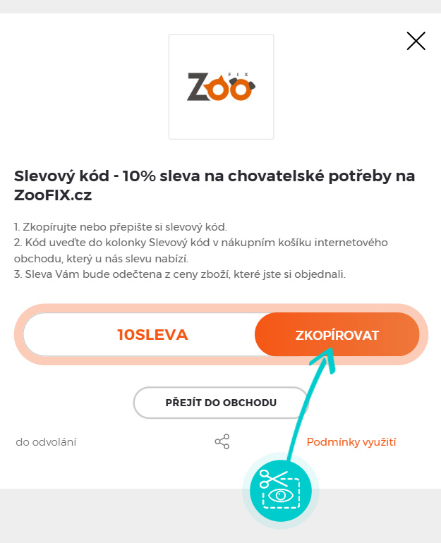 Zkopírujte nebo si opište slevový kód a klikněte na tlačítko "Přejít do obchodu". Následně budete přesměrováni přímo do eshopu zoofix.cz.