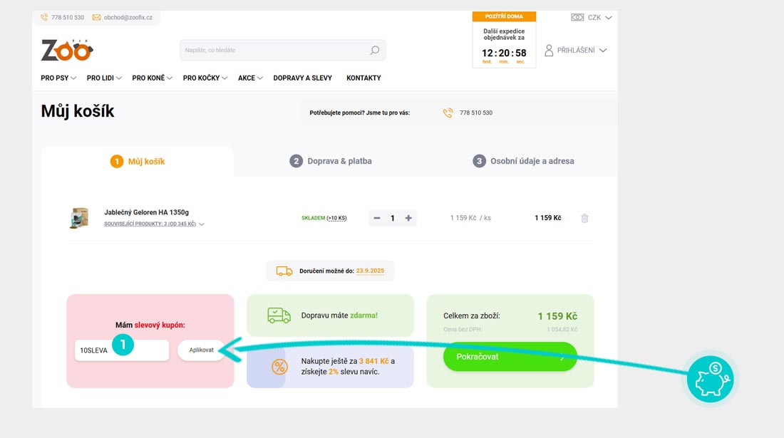 Vyberte si produkt v eshopu zoofix.cz, o který máte zájem, stiskněte tlačítko "Vložit do košíku" a produkt se automaticky vloží do nákupního košíku. Přímo v nákupním košíku vedle vybraných produktů klikněte na políčko "Kód poukazu". Zde vložte zkopírovaný slevový kód nebo jej ručně vepište a potvrďte tlačítkem "Uplatnit".