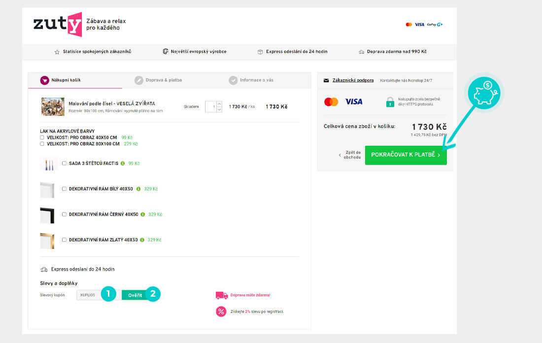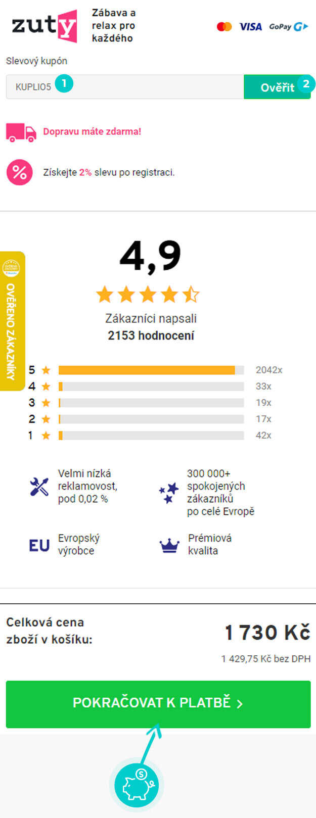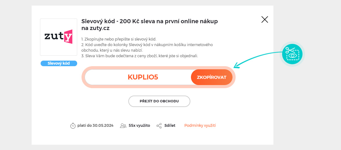 Zkopírujte nebo si opište slevový kód a klikněte na tlačítko "Přejít do obchodu". Následně budete přesměrováni přímo do e-shopu Zuty.cz.