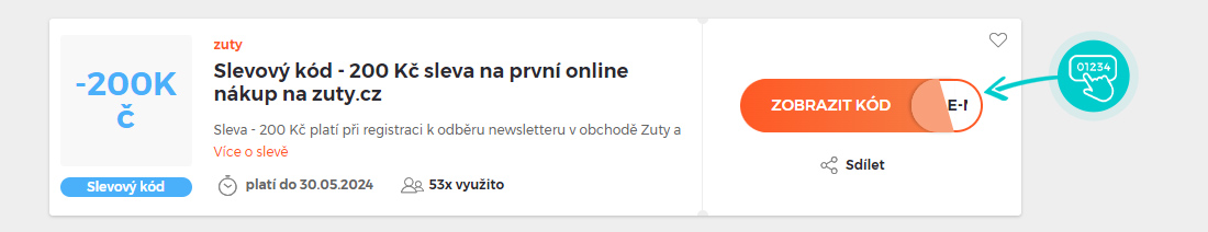 Vyberte si konkrétní slevový kód na naší stránce, který si chcete uplatnit v e-shopu Zuty.cz. Klikněte na oranžové tlačítko "Zobrazit kód".
