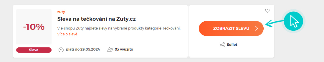 Vyberte si na naší stránce konkrétní Zuty slevu a klikněte na tlačítko "Získej slevu". Automaticky budete přesměrováni přímo na akční nabídku v internetovém obchodě Zuty.cz, kde můžete produkt nakoupit se slevou.